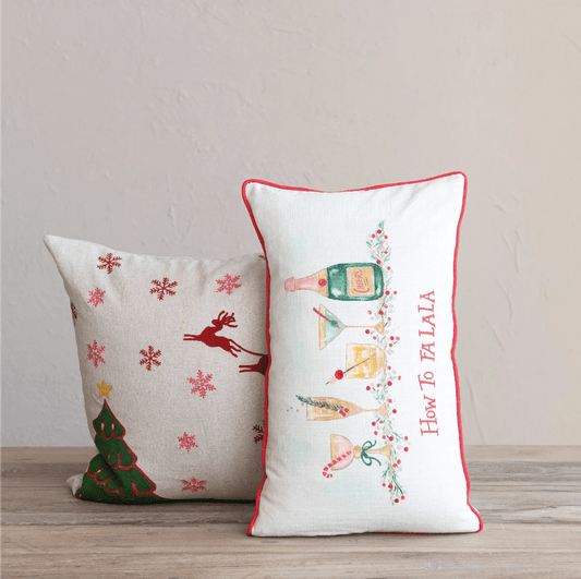 18" Square Cotton & Linen Printed Pillow w/ Reindeer, Embroidered Snowflakes & Tree