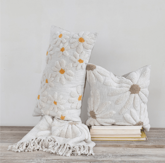 18" Square Cotton Slub Pillow with Tufted Flowers