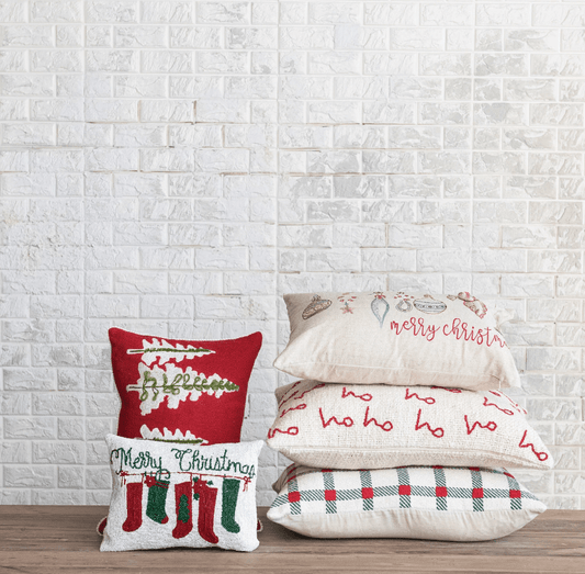 16" Square Cotton & Linen Pillow with Embroidered Mistletoe Pattern