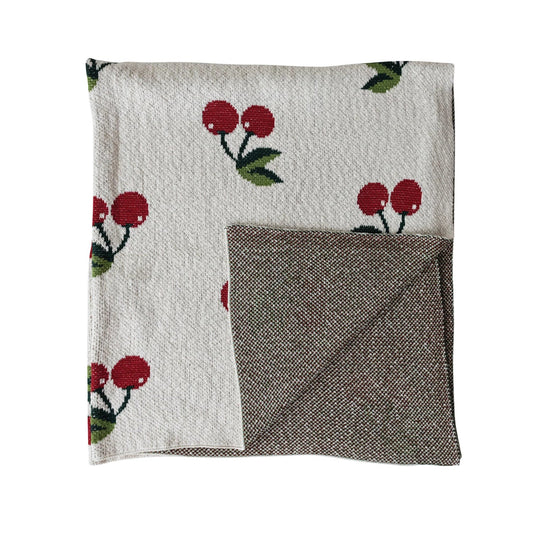 60"L x 50"W Cotton Knit Throw with Cherries, Natural, Red & Green