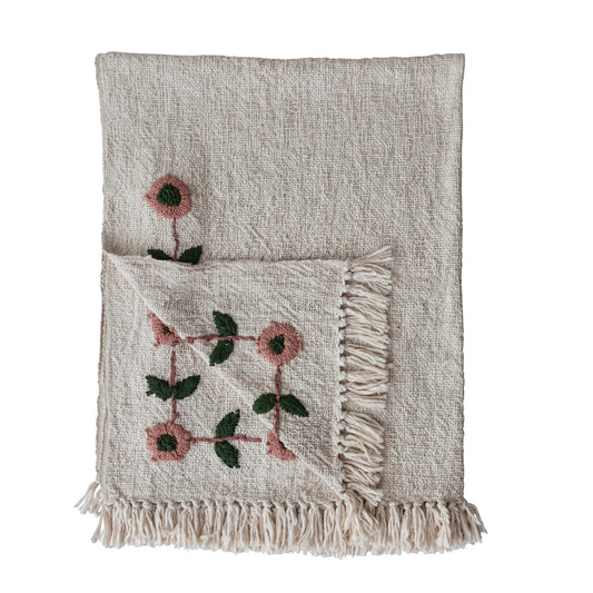 60"L x 50"W Woven Cotton Slub Throw with Hand-Embroidered Flowers & Fringe