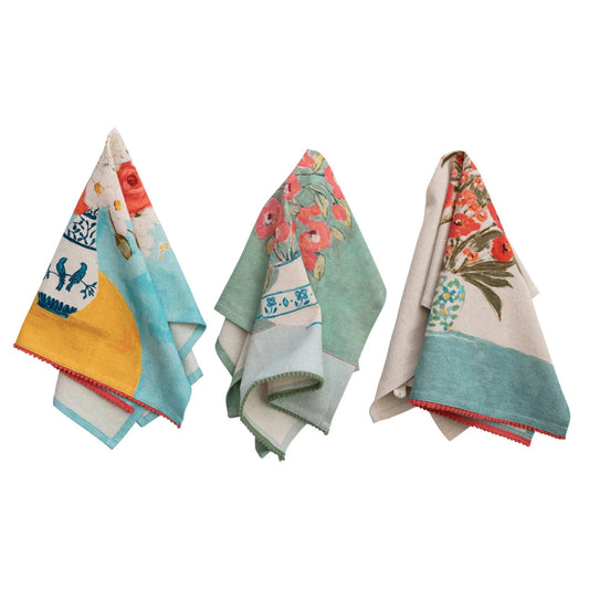 Cotton & Linen Printed Tea Towel w/ Flowers in Vase & Mini Pom Pom Trim, 3 Styles
