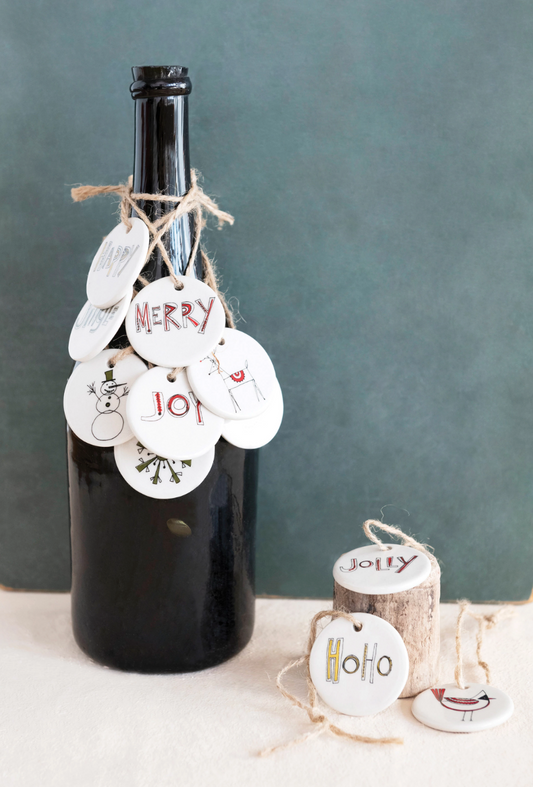 Round Stoneware Tag Ornament with Holiday Image/Word