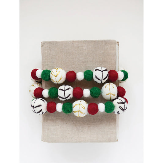 72"'L Wool Felt Ball Garland with Embroidery, Natural, Red and Green
