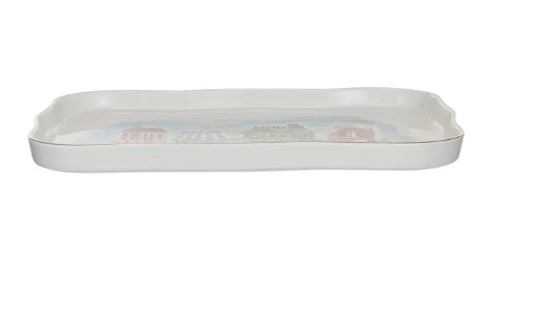 Stoneware Platter w/ Village Christmas Scene & Gold Electroplating