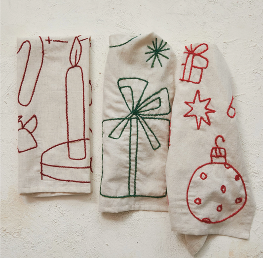 Woven Cotton & Linen Tea Towel w/ Embroidered Holiday Icons, 3 Colors, 3 Styles
