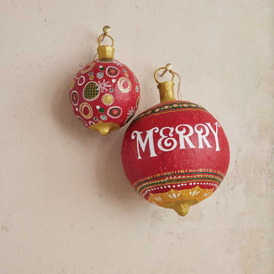 <In Store Purchase Only> Hand-Painted Metal & Paper Mache Ornament "Merry", Red & Green