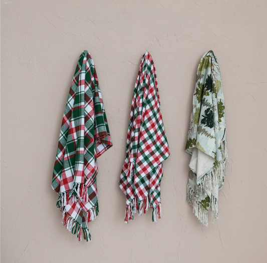 Cotton Slub Printed Throw w/ Trees Pattern & Fringe, Multi Color