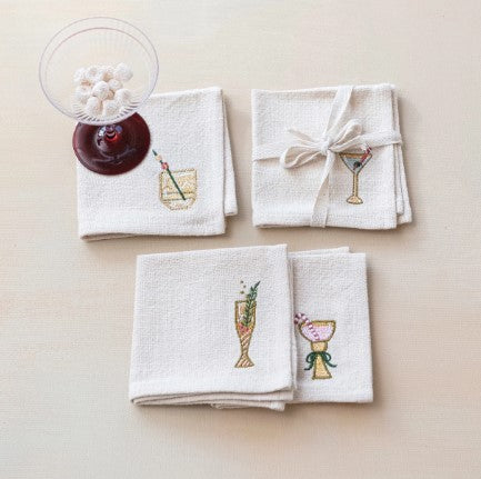 Cotton Cocktail Napkins w/ Embroidered Holiday Cocktail, Set of 4