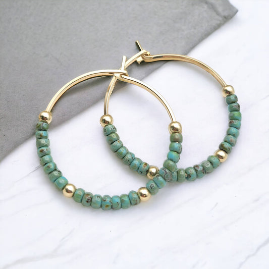Gold Filled Boho Hoop with Turquoise Beads - Summer Earrings