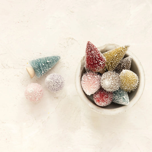 Sisal Bottle Brush Trees with Wood Bases, Snow Finish, Set of 12