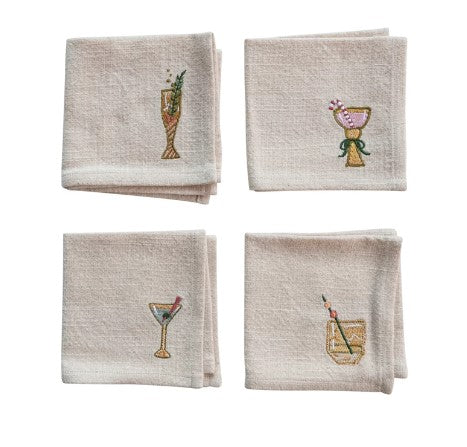 Cotton Cocktail Napkins w/ Embroidered Holiday Cocktail, Set of 4