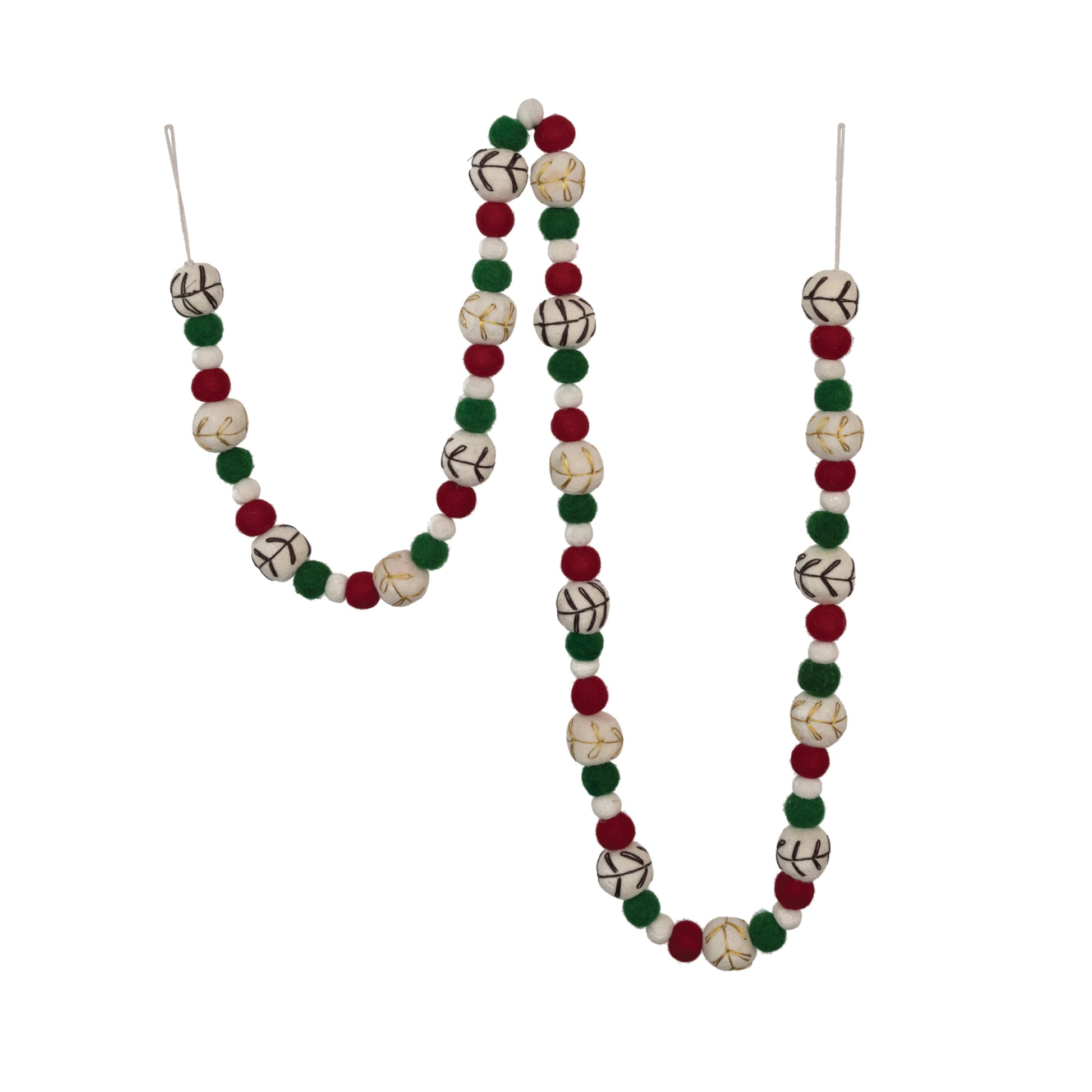 72"'L Wool Felt Ball Garland with Embroidery, Natural, Red and Green