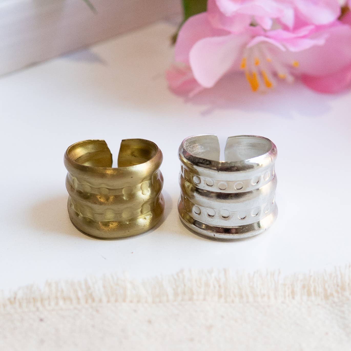 Textured satiny-matte metal is hand-formed into this luminous, dimensional ring. The sculptural technique gives it three smooth bands that are raised and rounded to form the outer and middle edges, and two textured indents with abstract circles dotting the center.