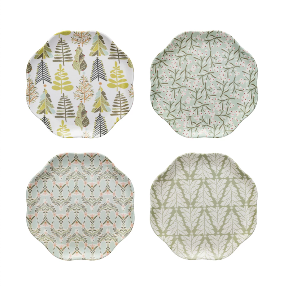11"L x 11"W Bamboo Melamine Scalloped Plate w/ Berry/Tree/Dove Pattern, Multi Color, 4 Styles