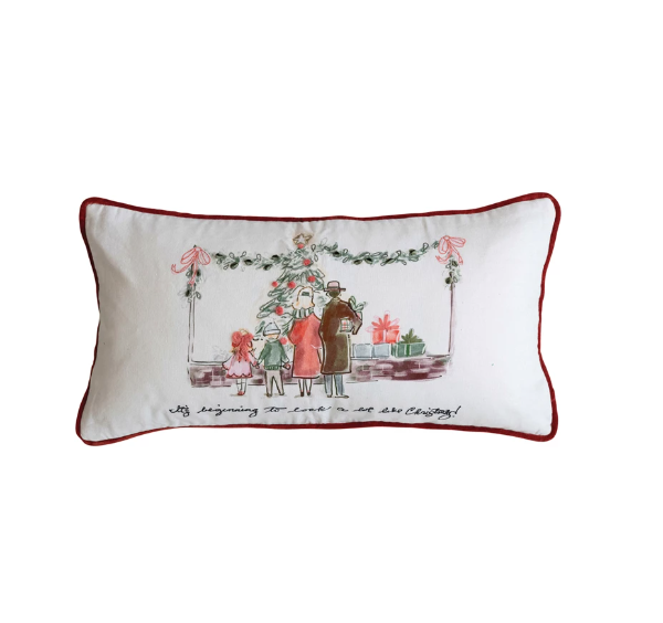 This cotton printed lumbar pillow brings the joy of the season to life with its charming family scene and the classic holiday phrase "It's Beginning to Look a Lot Like Christmas." The multicolor design is complemented by elegant piping and a plush velvet back, creating a pillow that's as stylish as it is comfortable.