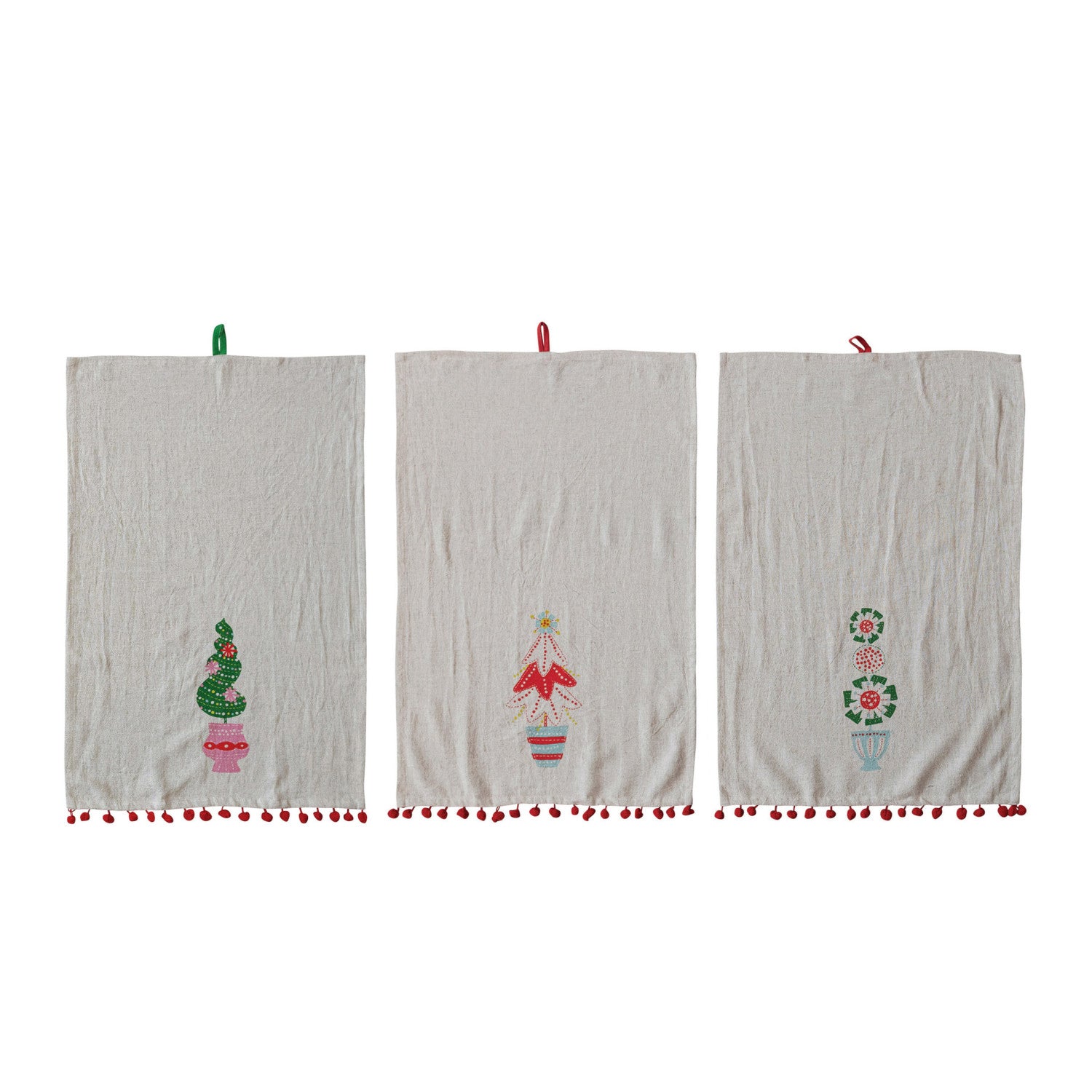 Linen Blend Printed Tea Towel w/ Topiary, Pom Pom Trim & Loop, 3 Styles