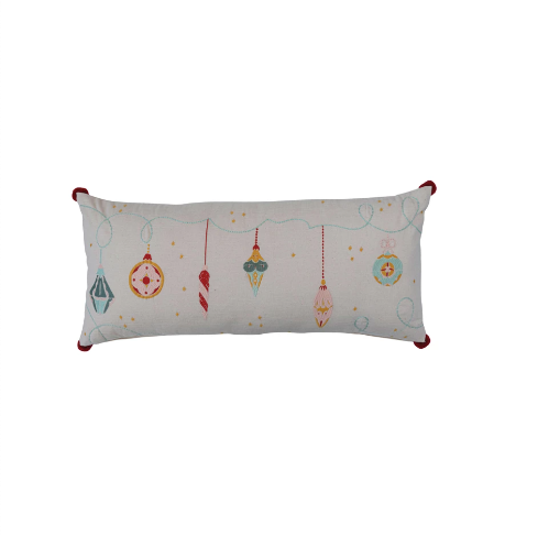 This multicolor pillow is a fun addition to your holiday decor. The creative, unique, and all-around beautiful design allows for versatility in style and joy in your living room. The 5 displayed ornaments are both cohesive to each other and match the fun tassels at each corner of the pillow. It will catch the attention of guests and create a warm environment to come home to.