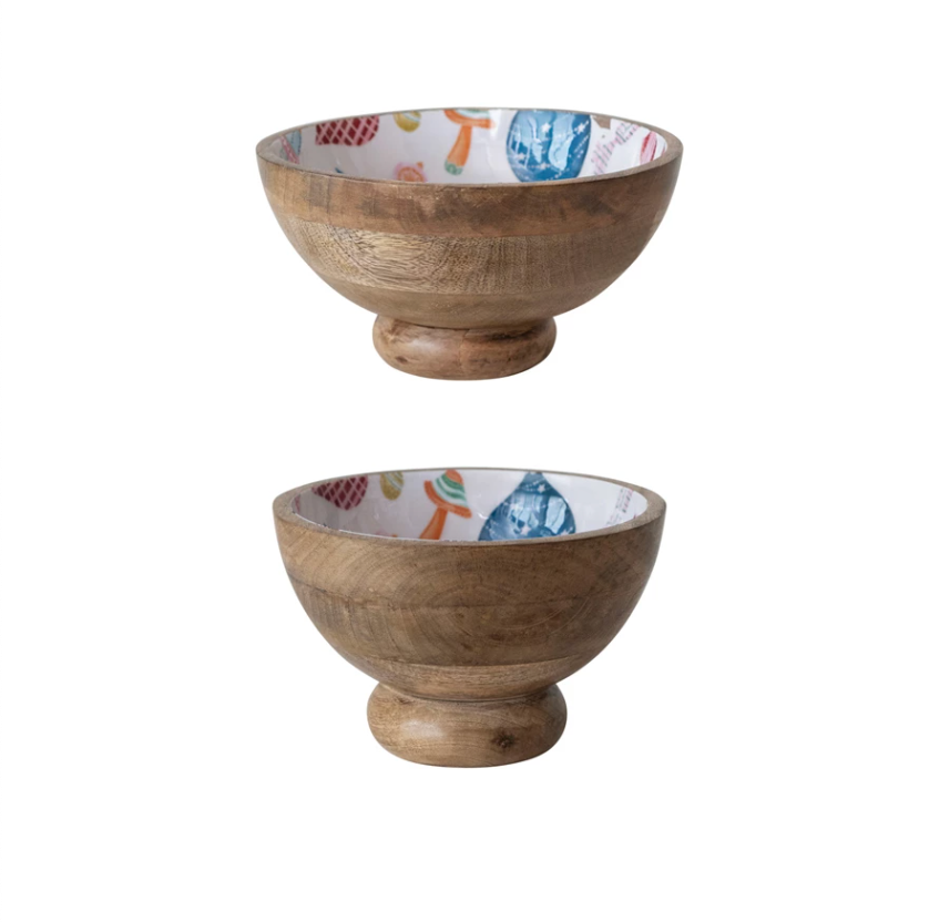 Enameled Mango Wood Footed Bowls w/ Seasonal Pattern
