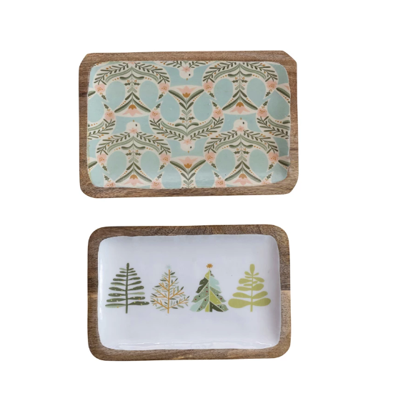Enameled Mango Wood Trays w/ Dove/Trees Patterns, 2 Styles