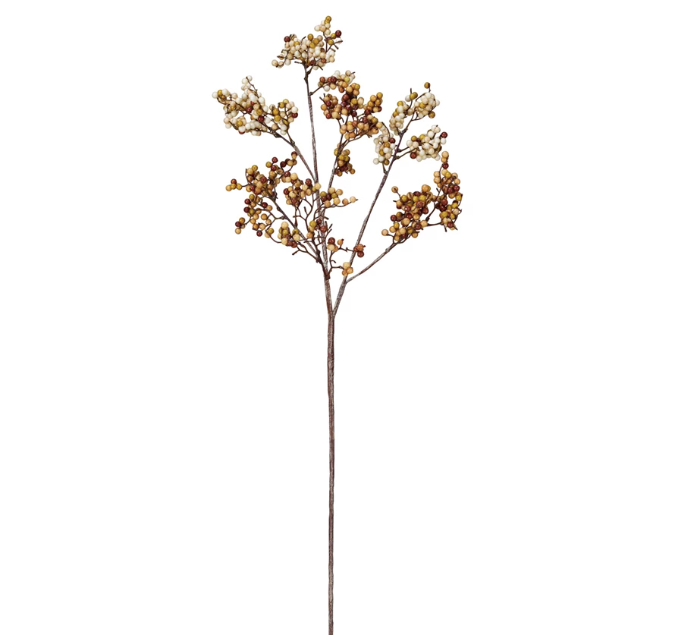 This cream and tan faux berry stem with metal and polyethylene is a graceful and elegant piece that will enhance any space. A soft, understated color scheme complements this unique display.