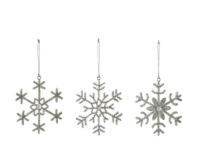 6"H Glass Beaded Metal & Acrylic Jewel Snowflake Ornament, Silver Finish, 3 Styles