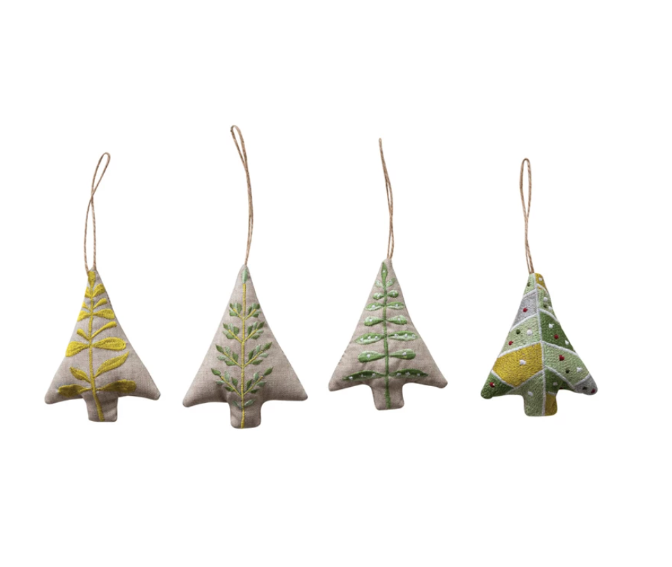 This set of 4 cotton chambray tree ornament with embroidery is a beautiful and unique way to add some holiday cheer to home. The ornament features a soft and durable cotton chambray fabric in green, yellow, or cream, embellished with multicolor embroidery in 4 different styles.