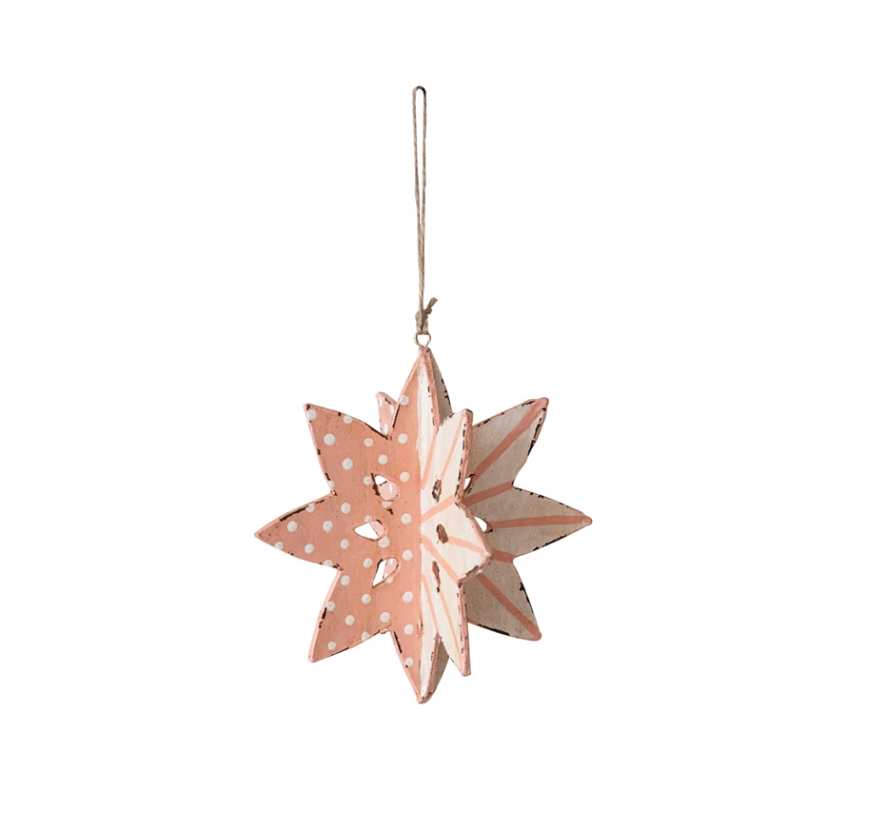 This whimsical winter snowflake ornament is a handcrafted treasure. Hand painted with a sweet pattern of dots and stripes, it stands 5 inches tall against a soft pink and white background.