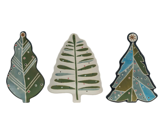 Add a touch of whimsy to your table with our Hand-Painted Stoneware Tree Shaped Plates. Each plate features a unique tree design with wax relief detail. Use as a tray for snacks or as a decorative piece. Available in 3 styles. Tree-mendously charming!