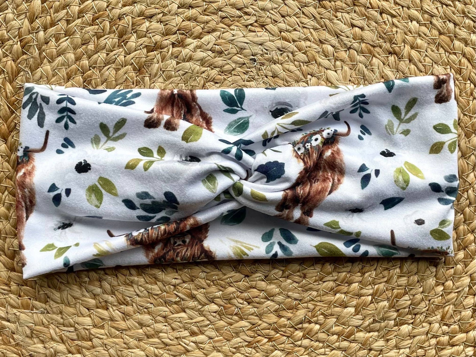 Highland Cow White Floral Knit Twist Headband