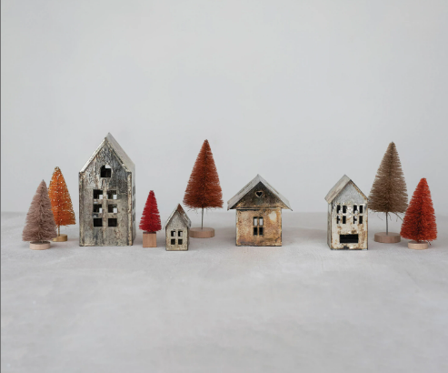 One of many adorable metal houses with a rustic pewter finish. This house features a tall base and small yet numerous windows. This house matches a set to form a small holiday town on your mantel or can standalone with some small model trees to create a cozy cabin scene.